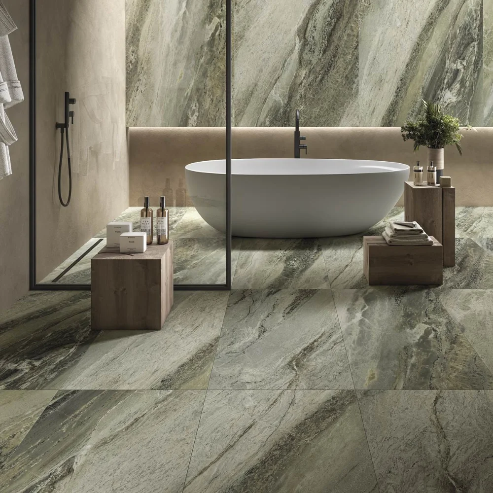 Available in 60×120 cm format and two sophisticated finishes — matt and gloss — Green Waves brings an organic, luxurious atmosphere to both walls and floors. Its soft chromatic balance and natural texture make it ideal for bathrooms, living rooms, and open spaces, where it creates a seamless flow between surfaces.