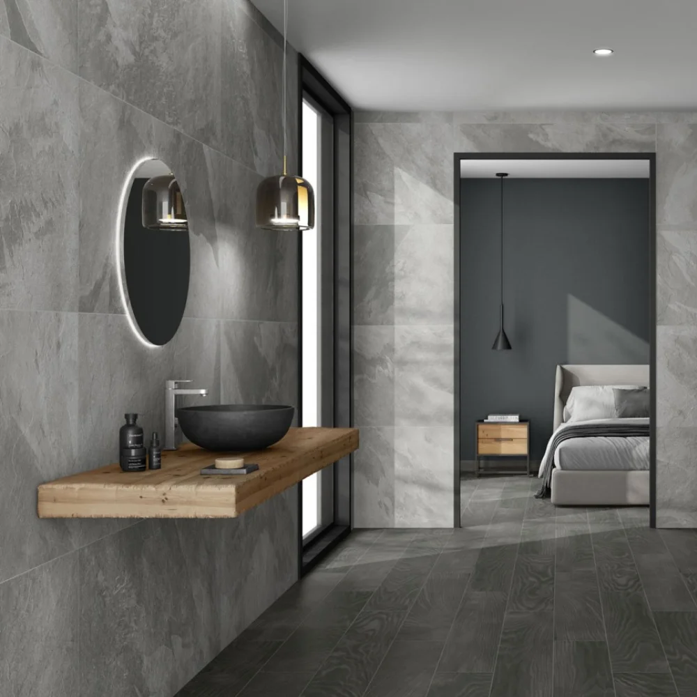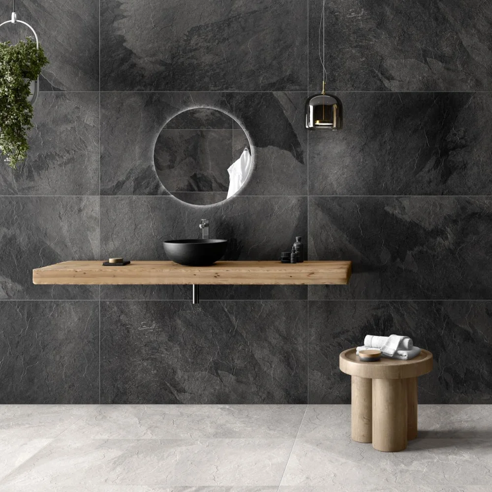 The Slate collection captures the authentic beauty of natural stone with the performance of porcelain stoneware. Its textured surface and soft tonal variations recreate the organic character of slate while maintaining a refined and modern aesthetic.