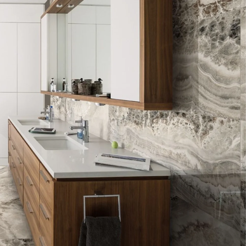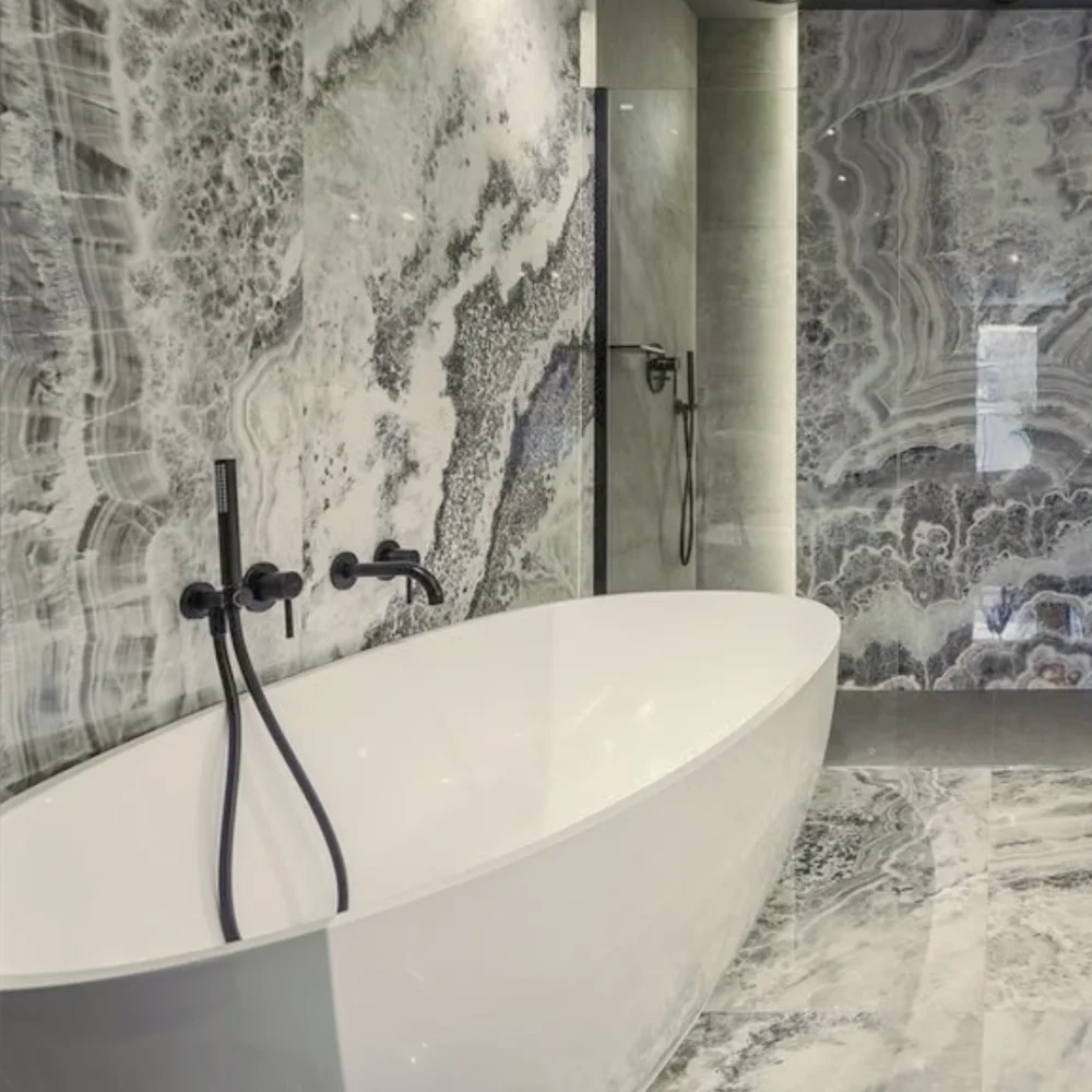 With their large 60×120 cm porcelain format, Sublime tiles bring scale and continuity to interiors. The glossy finish reflects light and adds a luxurious atmosphere, while the matt version softens the design for a contemporary look. Suitable for walls and floors, they work beautifully in living rooms, kitchens, bathrooms, or commercial projects. The Sublime collection combines the dramatic character of natural stone with the performance and durability of porcelain.