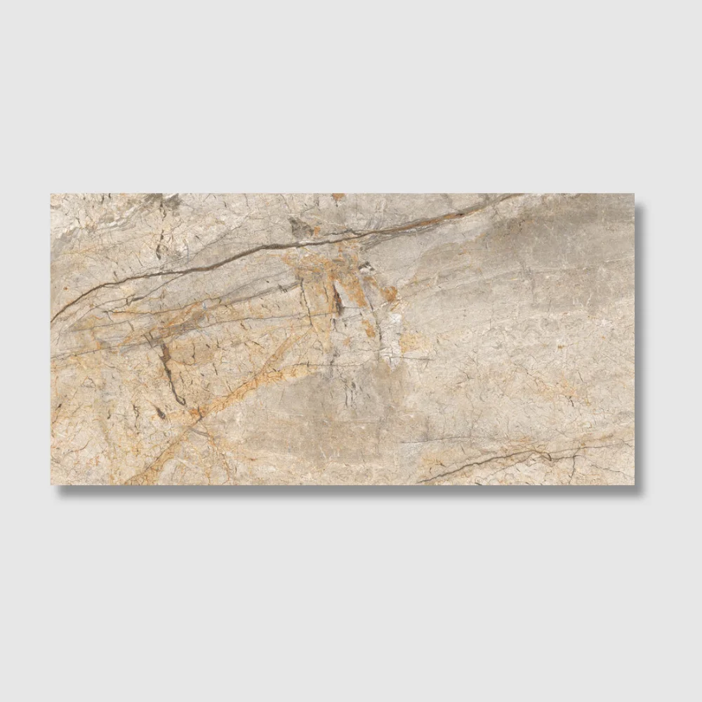 The Supreme collection offers marble-effect porcelain tiles in two finishes: polished (Supreme G) and matt (Supreme M). Both versions feature a beige base enriched with veining that shifts from yellow to grey and deep brown.